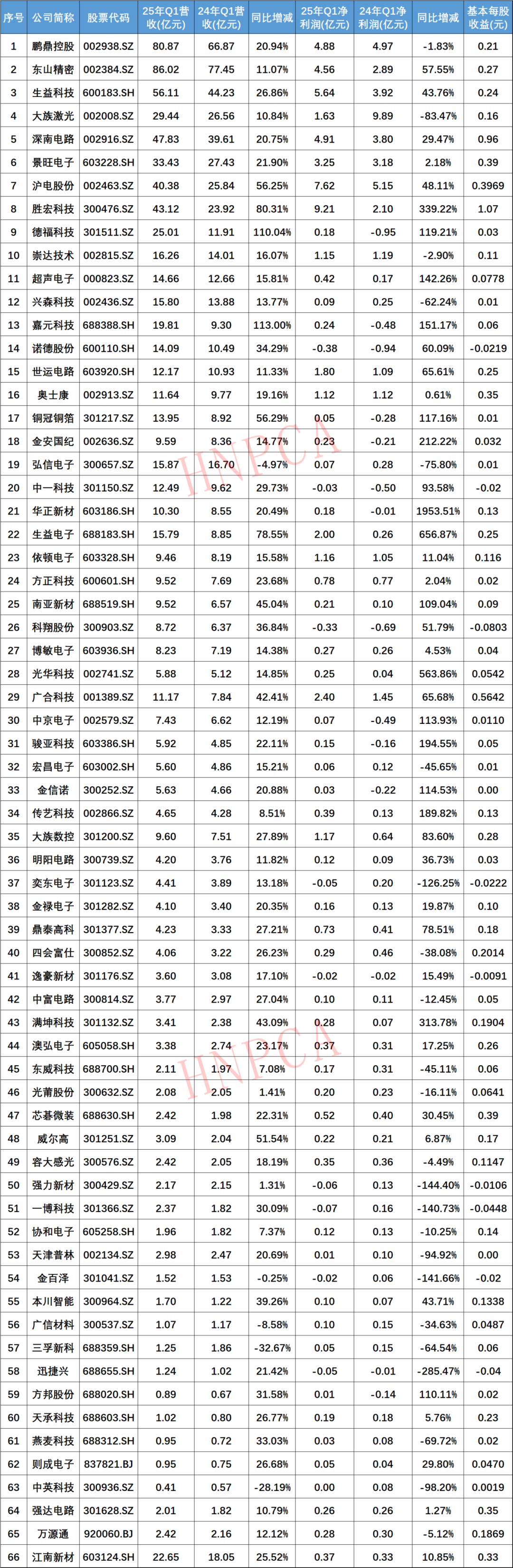 截至4月29日晚,A股PCB行業(yè)66家企業(yè)完成2025年第一季度業(yè)績披露,詳情如下: