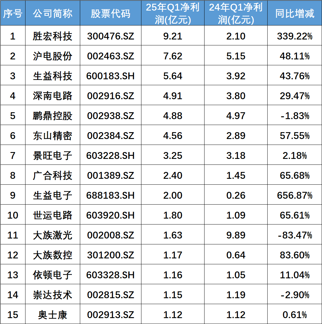 共有15家企業(yè)凈利潤破億,合計凈利潤52.51億元,占總凈利潤的87.13%。其中,勝宏科技、滬電股份、生益科技分別以9.21億元、7.62億元和5.64億元的凈利潤位列前三,凈利潤同比增長分別達(dá)到339.22%、48.11%、43.76%。